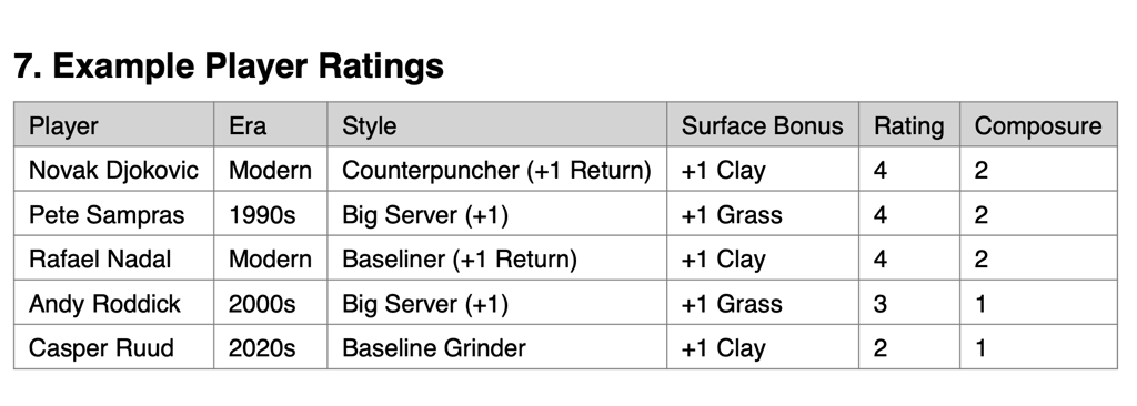 The idea is to be able to generate Historical players as well as fictional players. I've put together the first draft of rules as well as the expansion rules for creating players and quick play results using dice.
