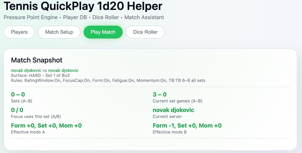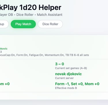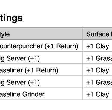 I've been working on a new game which i'll do a video about soon. Its a tennis game, quickplay that uses D20 opposed rolls.